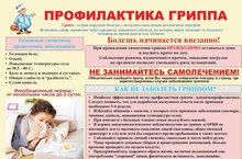 Ранняя профилактика сезонного гриппа1. Самым надежным и эффективным методом профилактики является вакцинация от гриппа.2. Обсудите со своим врачом, как вы можете уберечь своих детей и других членов семьи от гриппа в предстоящем сезоне.Профилактика в период эпидемии гриппа1. Избегайте посещения мероприятий и мест с массовым скоплением народа.2. Соблюдайте гигиену рук. Мойте руки водой с мылом как можно чаще, особенно после кашля или чихания. Также эффективным является средства для обработки рук на основе спирта.3. Следите за состоянием здоровья ребенка и других членов семьи: проверяйте температуру тела и наличие других симптомов гриппа.4. Ограничьте контакты ребенка со сверстниками, исключите контакты с людьми с симптомами гриппоподобного заболевания.5. Подумайте, как обеспечить уход за ребенком дома, в случае если он заболеет.6. Подберите игры, книги, видеодиски и другие вещи, необходимые для развлечения в кругу семьи на случай, если отменят занятия в школе или если ваш ребенок заболеет и будет вынужден оставаться дома.В случае заболевание одного из членов семьи все дети дошкольного возраста должны оставаться дома в течение 5 дней с момента заболевания родственника. -