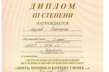 Ученик 2 класса Марков Дмитрий занял 3 место в VIII Республиканской конференции исследовательских краеведческих работ «Жить, помня о корнях своих…», которая проходила в г. Нижнекамск. Дима и его наставники, Маханько Ольга Николаевна и Храмова Гульнара Рафагатовна, представили работу о военном котелке. -
