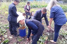 Осень — время сбора урожая. Сентябрьская погода порадовала нас тёплым солнечным деньком и мы, вооружившись перчатками, вёдрами и вилами, отправились на пришкольный участок, собирать урожай.