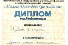14 апреля 2018 в «Набережночелнинском государственном педагогическом университете» открылась 10 Республиканская с международным участием научно-практическая конференция учащихся «Малые Давыдовские чтения». Диплом победителя конференции вручён Разуваевой Виктории за лучшую исследовательскую работу. После защиты свей работы Виктория приняла участие в Чемпионате научных исследователей. «Сундук – хранилище истории». Она представила свой проект самому Владимиру Владимировичу Путину, роль которого исполнял ученик гимназии №77 города Набережные Челны. В результате - второй Диплом - за 2 место в Чемпионате. -