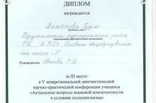 Поздравляем ученицу 8 класса Хаметову Гузель(руководитель Иванова Р.М.), занявшую 3 место в V Межрегиональной лингвистической научно-практической конференции учащихся «Актуальные вопросы языковой компетентности в условиях полилингвизма». Гордимся! -