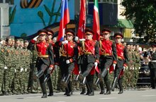 На параде Победы кадеты несли знамя Победы и флаги Российской Федерации, Республики Татарсан. Младшие кадеты проходили строем.