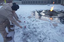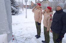 В этот день юнармейцы провели Вахту памяти с возложением цветов у Вечного огня, кадеты расчистили от снега памятник 352-й стрелковой дивизии и возложили цветы.