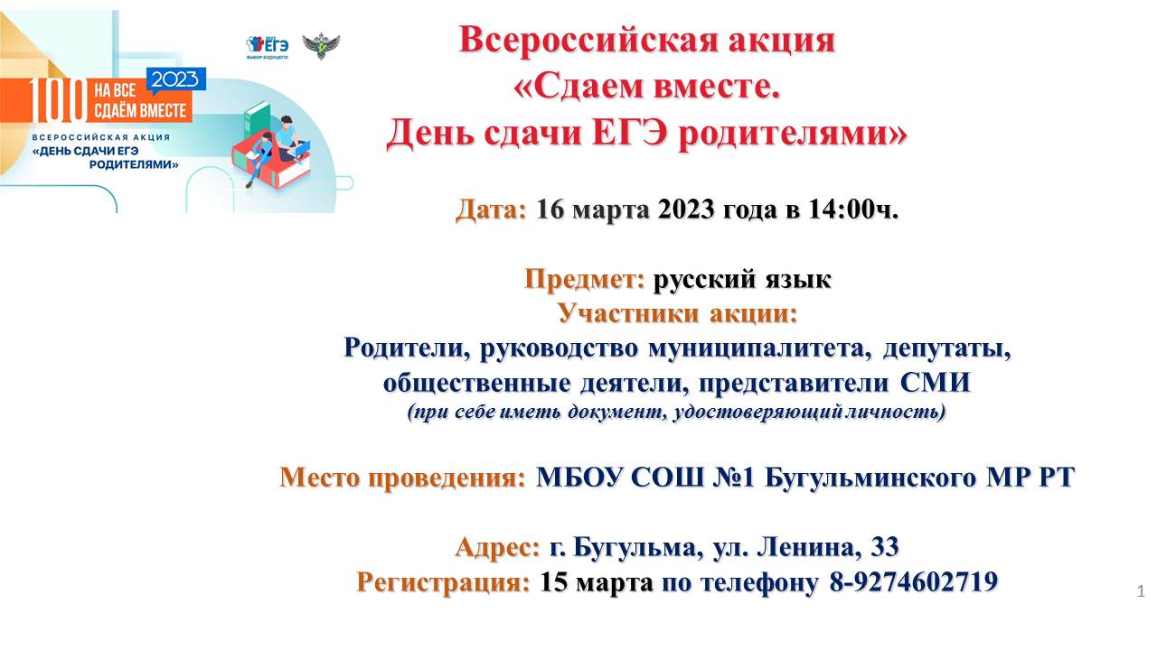 Уважаемые родители, приглашаем Вас принять участие во Всероссийской акции "Сдаем вместе. День сдачи ЕГЭ родителями". Акция пройдет 16 марта в 14.00 в МБОУ СОШ №1 по адресу: г.Бугульма, ул.Ленина, д.33. Регистрация 15 марта по телефону 89274602719 НАШ Анонс
