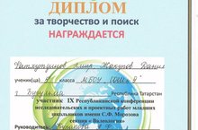 Зайков Данил -учащийся 3 Б класса участвовал в IX открытой республиканской конференции исследовательских и проектных работ младших школьников им. С.Ф. Морозова по теме: «Исследование свойств талой снеговой воды г. Бугульма и ее влияние на биоорганизмы» (исследовательский проект) и занял 1 место.