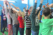 В спортивном зале вожатые для отдыхающих в школьном зимнем лагере, провели "Веселые старты".