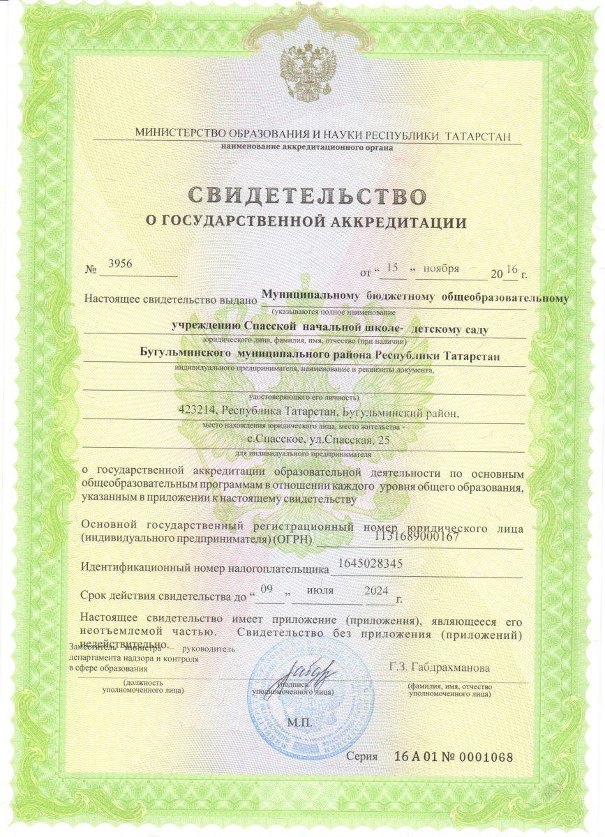 Муниципальное бюджетное общеобразовательное учреждение Спасская начальная школа - детский сад Бугульминского муниципального района РТ/ Татарстан Республикасы Бөгелмә муниципаль районы, муниципаль бюджет гомуми белем бирү учреждениесе Спас башлангыч мәктәбе – балалар бакчасы.