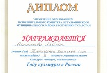 3 апреля состоялся муниципальный конкурс чтецов посвященный Году Культуры в России где ученица 8 ласса Маннапова Ляйсан выступив успешно заняла 3 место.(учитель Зайнуллина Р.Д.) Молодец! Мы все рады за нее!