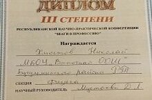 Ученик 8 класса Хлюстов Николай занял 3 место в секции «Физика». Подготовила призёра учитель физики Мустаева Динара Линаровна.