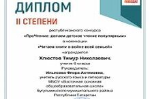 Республиканский конкурс «ПроЧтение: делаем детское чтение популярным» в номинации «Читаем книги о войне всей семьёй», ученик 6 класса Хлюстов Тимур занял 2 место. Подготовила призёра учитель русского языка и литературы Ильясова Флёра Ахтямовна.