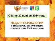 В период с 18 по 22 ноября 2024 года пройдёт традиционная осенняя Неделя психологии. Всероссийская Неделя психологии проводится во исполнение пункта 113 плана основных мероприятий, проводимых в рамках Десятилетия детства, на период до 2027 года, утвержденного распоряжением Правительства Российской Федерации от 23 января 2021 г. № 122-р, пунктом 33 Плана мероприятий на 2024 – 2030 годы по реализации Концепции развития системы психолого-педагогической помощи в сфере общего образования и среднего профессионального образования в Российской Федерации на период до 2030 года, утвержденной Министерством просвещения Российской Федерации 18 июня 2024 г. № СК-13/07.