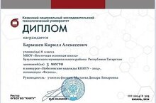 Барышев Кирилл, ученик 8 класса, занял 3 место в конкурсе «Нобелевские надежды КНИТУ – 2024», номинация «Физика». Руководитель: учитель физики Мустаева Д. Л.