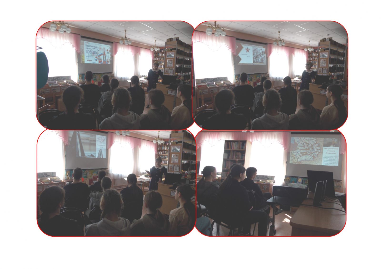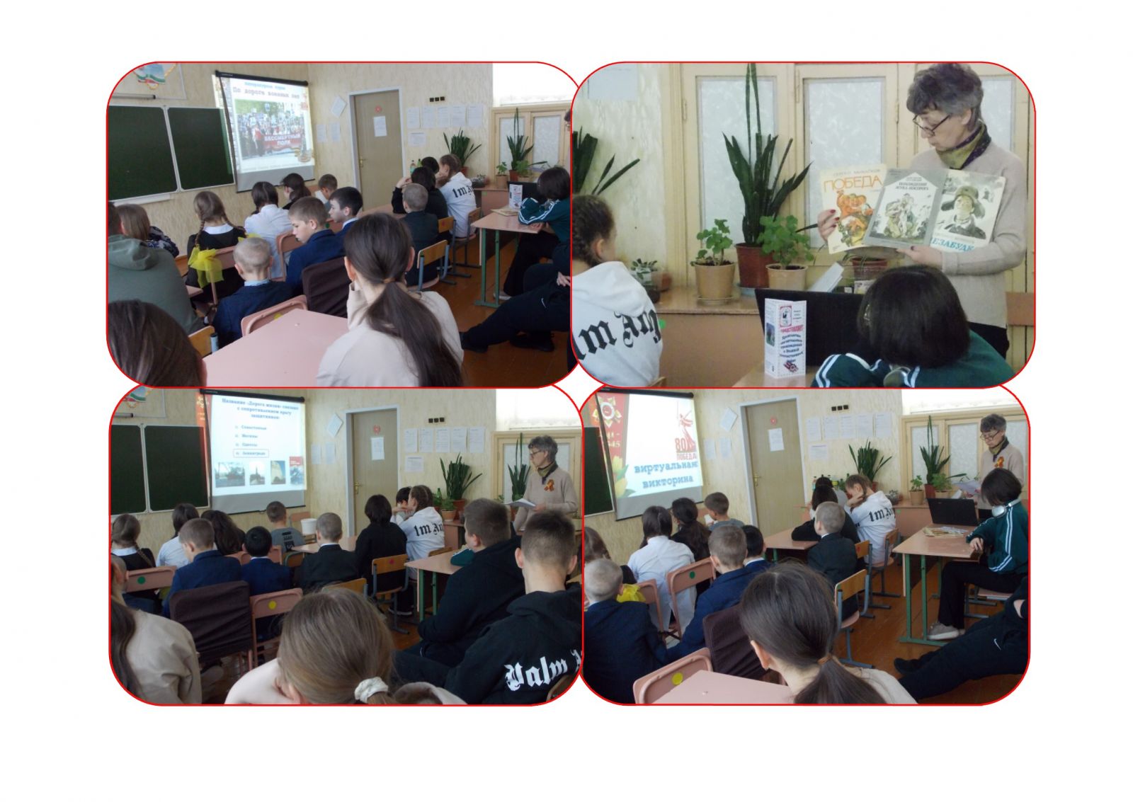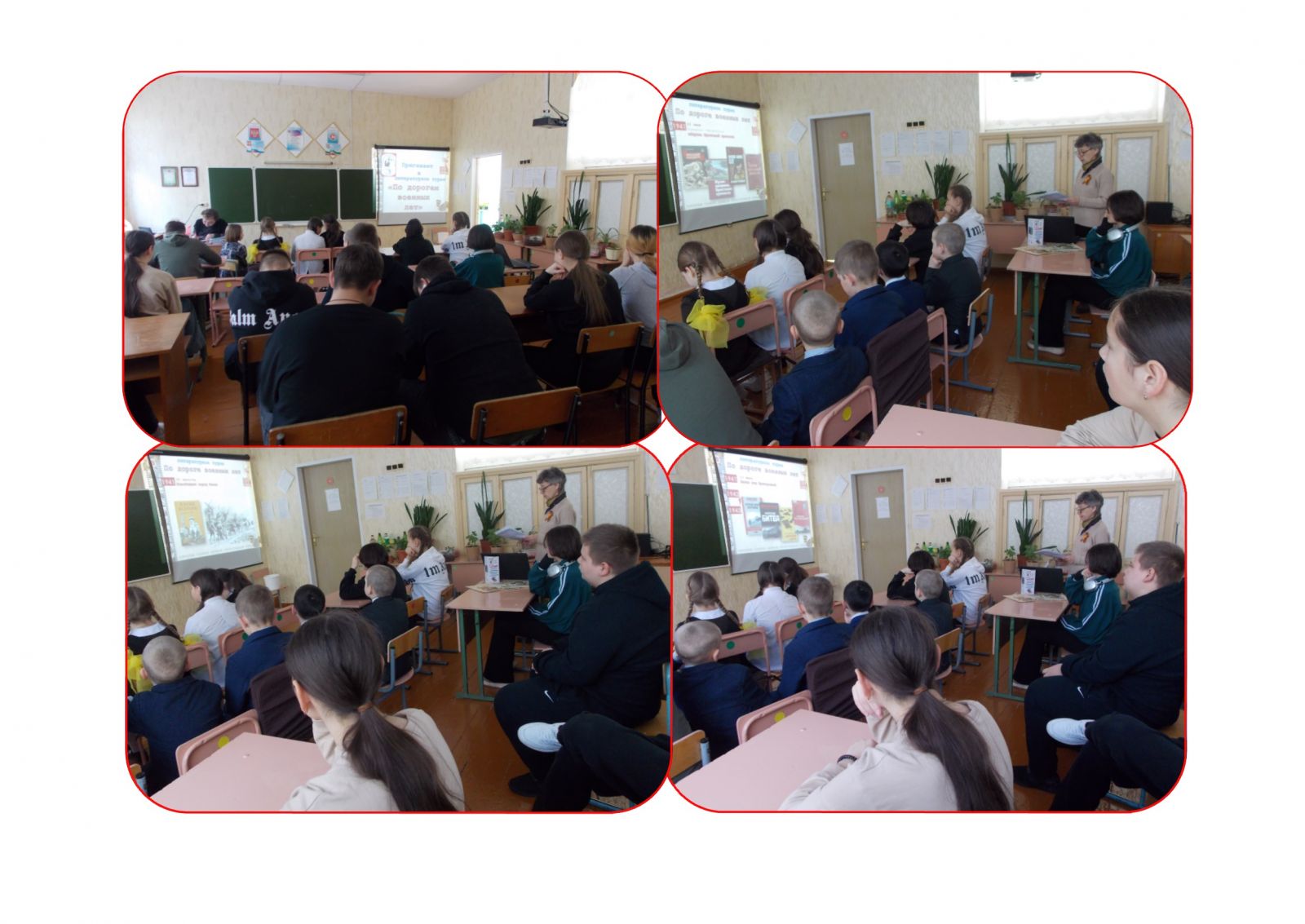 Учащиеся и педагоги школы были приглашены на литературное турне «По дорогам военных лет», где шла речь о том, какой ценой была завоевана победа в Великой Отечественной войне 1941-1945 годов, о мужественных защитниках Бреста и Сталинграда, о блокадном Ленинграде, о клятве героев-панфиловцев и Курской дуги защищать свою Родину до последней капли крови. Интерес у присутствующих вызвал рассказ сельского библиотекаря об истории возникновения шествия Бессмертного полка и акции «Георгиевская ленточка». Внимание читателей было обращено на то, что хотя поколение, которое помнит эту войну, ушло, но не уходит память о подвиге народа: она остается в книгах, фотографиях, фильмах, рассказах, в нашей памяти.