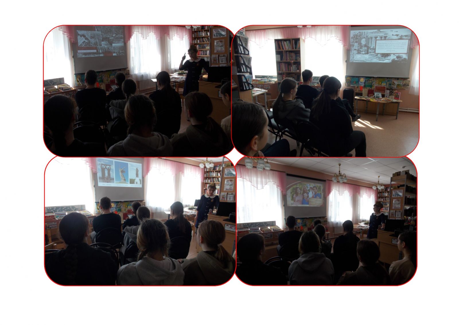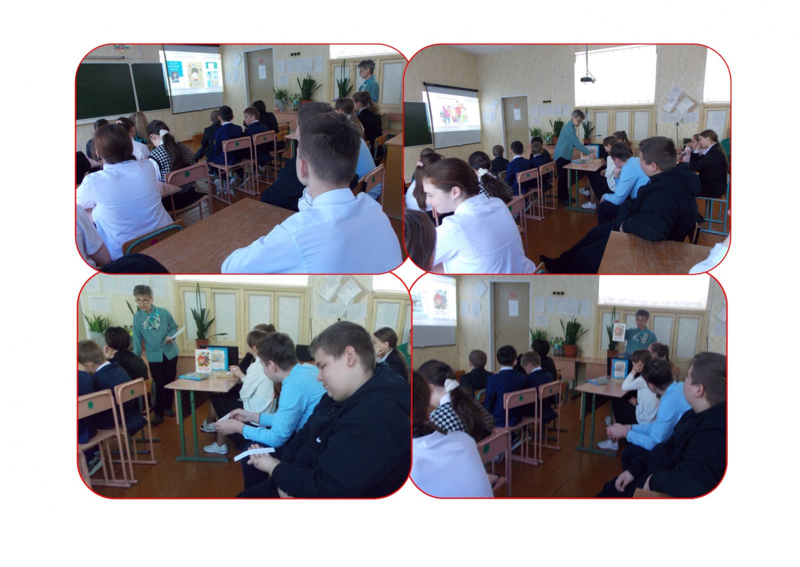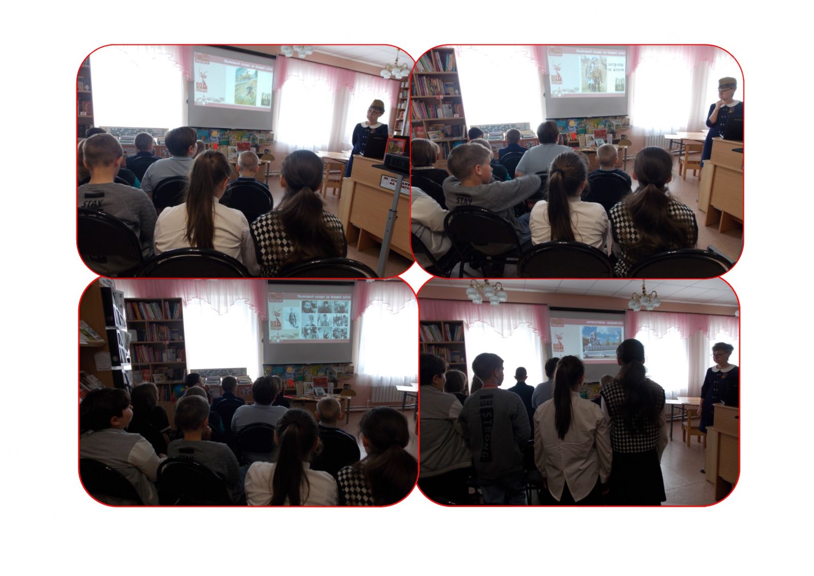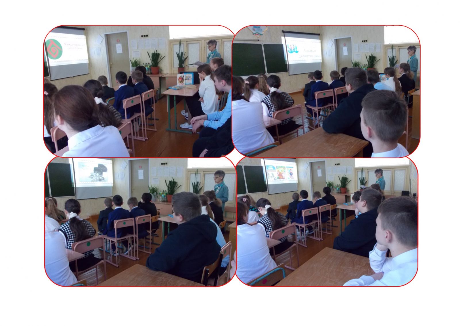 Учащиеся и педагоги школы были приглашены на литературное турне «По дорогам военных лет», где шла речь о том, какой ценой была завоевана победа в Великой Отечественной войне 1941-1945 годов, о мужественных защитниках Бреста и Сталинграда, о блокадном Ленинграде, о клятве героев-панфиловцев и Курской дуги защищать свою Родину до последней капли крови. Интерес у присутствующих вызвал рассказ сельского библиотекаря об истории возникновения шествия Бессмертного полка и акции «Георгиевская ленточка». Внимание читателей было обращено на то, что хотя поколение, которое помнит эту войну, ушло, но не уходит память о подвиге народа: она остается в книгах, фотографиях, фильмах, рассказах, в нашей памяти.
