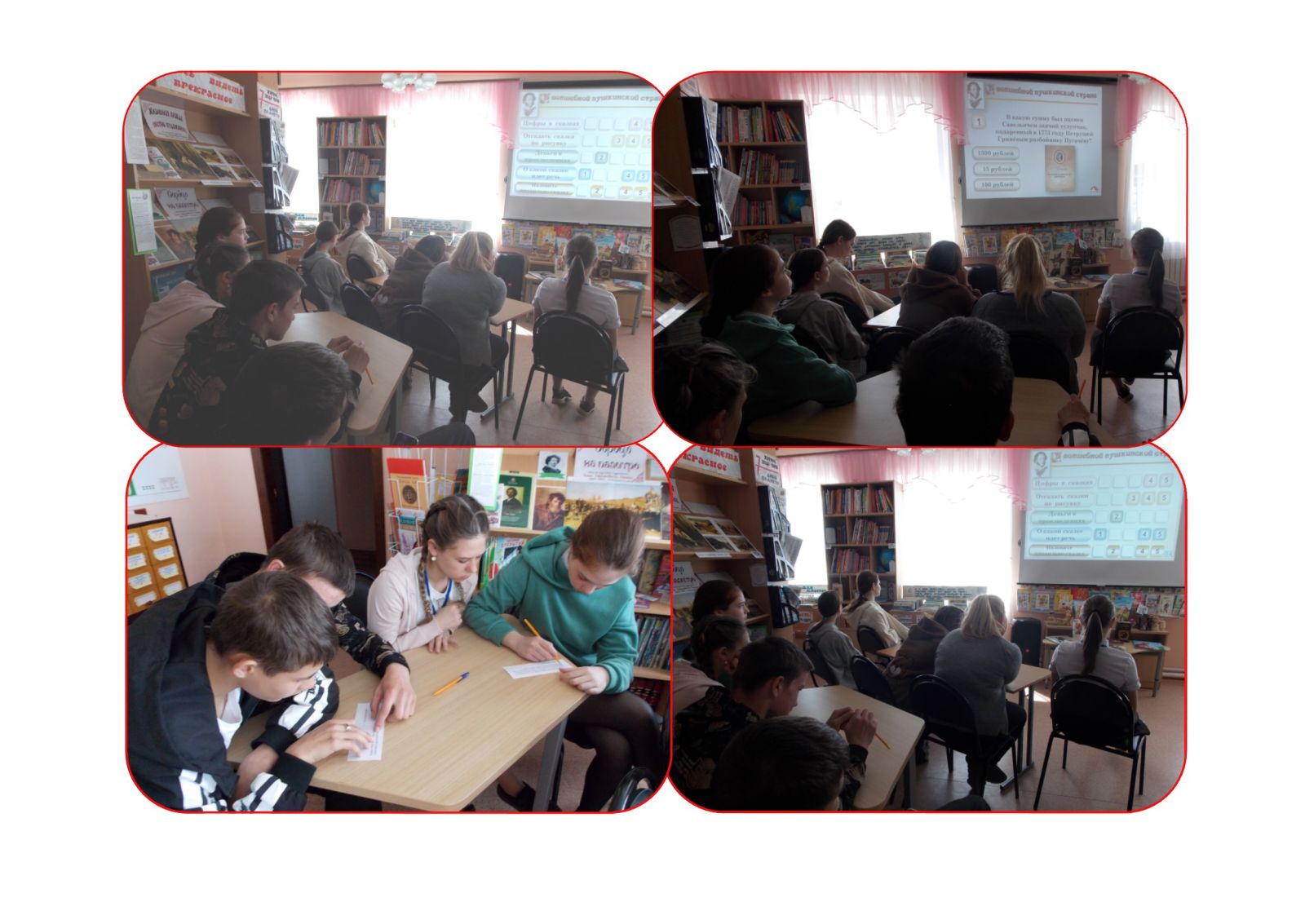 9 классов были приглУчащиеся 8-ашены в сельскую библиотеку на библиокайтсёрфинг «В волшебной пушкинской стране» по станицам произведений А.С. Пушкина. Вначале библиотекарь обратила внимание пользователей на книги, рассказывающие о жизни и творчестве стихотворца, а также его произведения. Затем читатели отвечали на вопросы, состоящие из 5-ти категорий: «Назовите правильно сказку», «О какой сказке идет речь», «Деньги в произведениях Пушкина», «Отгадать сказки по рисунку», «Цифры в сказках». За правильный ответ жюри зачисляло на счет игроков баллы.