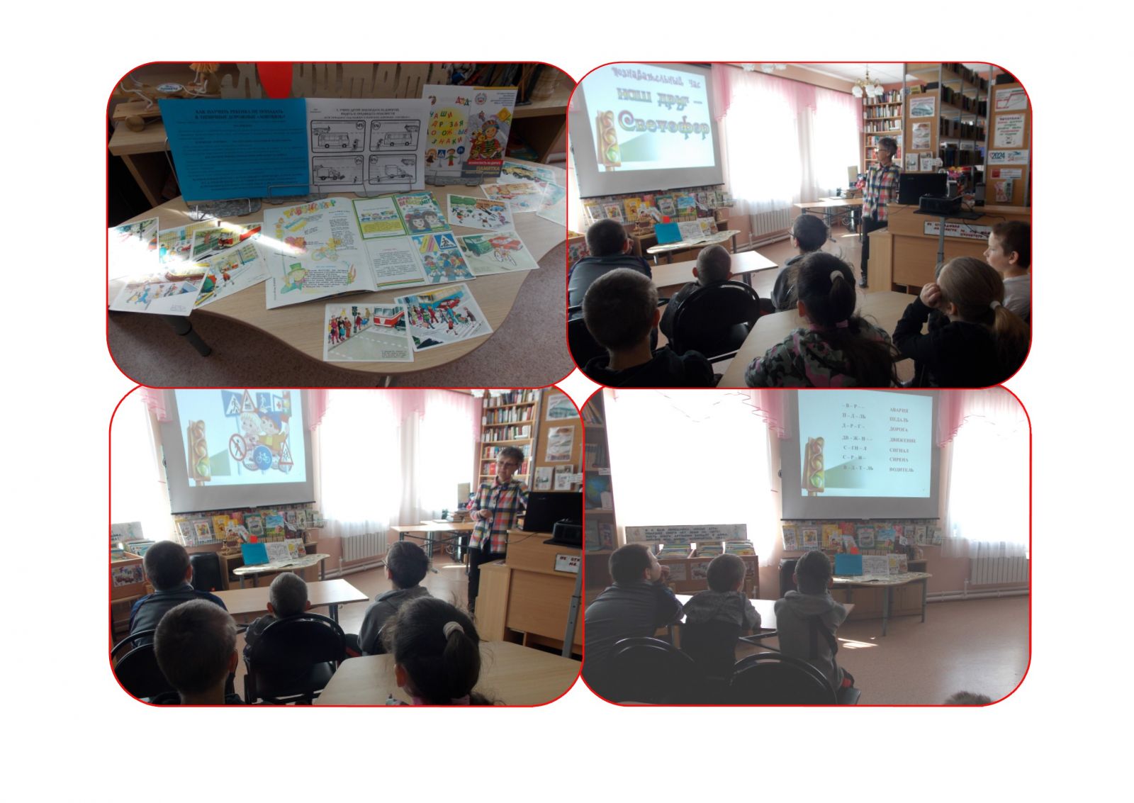 В сельской библиотеке для учеников школы прошел познавательный час «Наш друг – Светофор». Библиотекарь обратила внимание детей, что лето – это не только наслаждение свободой и приключениями, но и можно столкнуться с рисками и опасностями на дорогах. В доходчивой форме было дано объяснение, как правильно вести себя на улице, во время перехода дороги, в общественном транспорте, при езде на велосипеде. Кроме этого, проводилась викторина «Красный, желтый, зеленый» по правилам дорожного движения. В заключение познавательного часа все присутствующие участвовали в мастер-классе по изготовлению книжных закладок с изображением дородных знаков