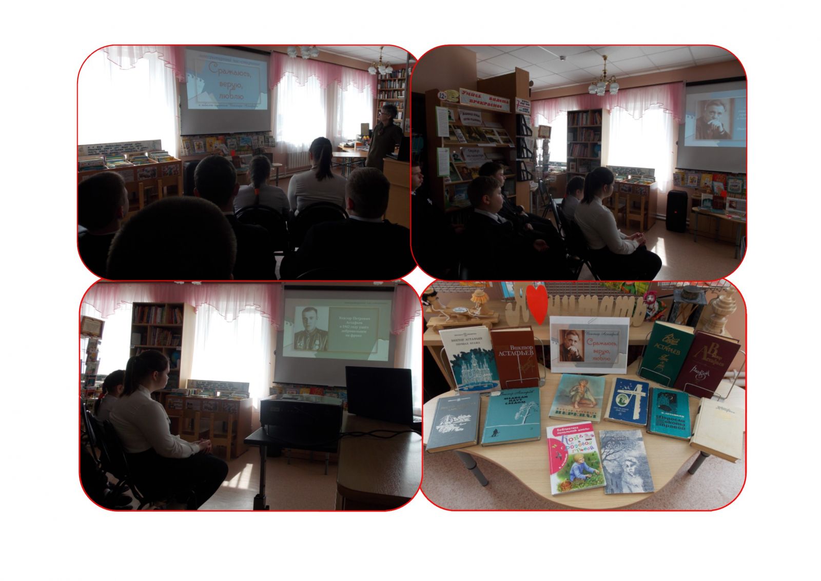Учащиеся 6-9 классов были приглашены на литературный час-открытие «Сражаюсь, верую, люблю», где речь шла о писателе, драматурге, сценаристе, Герое Социалистического труда, мастере живого русского литературного языка Викторе Петровиче Астафьеве. Он рано остался без родителей, беспризорничал, воевал в годы Великой Отечественной войны, был ранен, встретил на войне свою любовь. Кроме этого, библиотекарь на примере произведений автора раскрыла богатый мир чувств, образов, характеров, созданных в повестях и рассказах автора, среди которых «Васюткино озеро», «Перевал», «Последний поклон», «Кража». Рассказ сопровождалось красочными иллюстрациями и фотографиями.