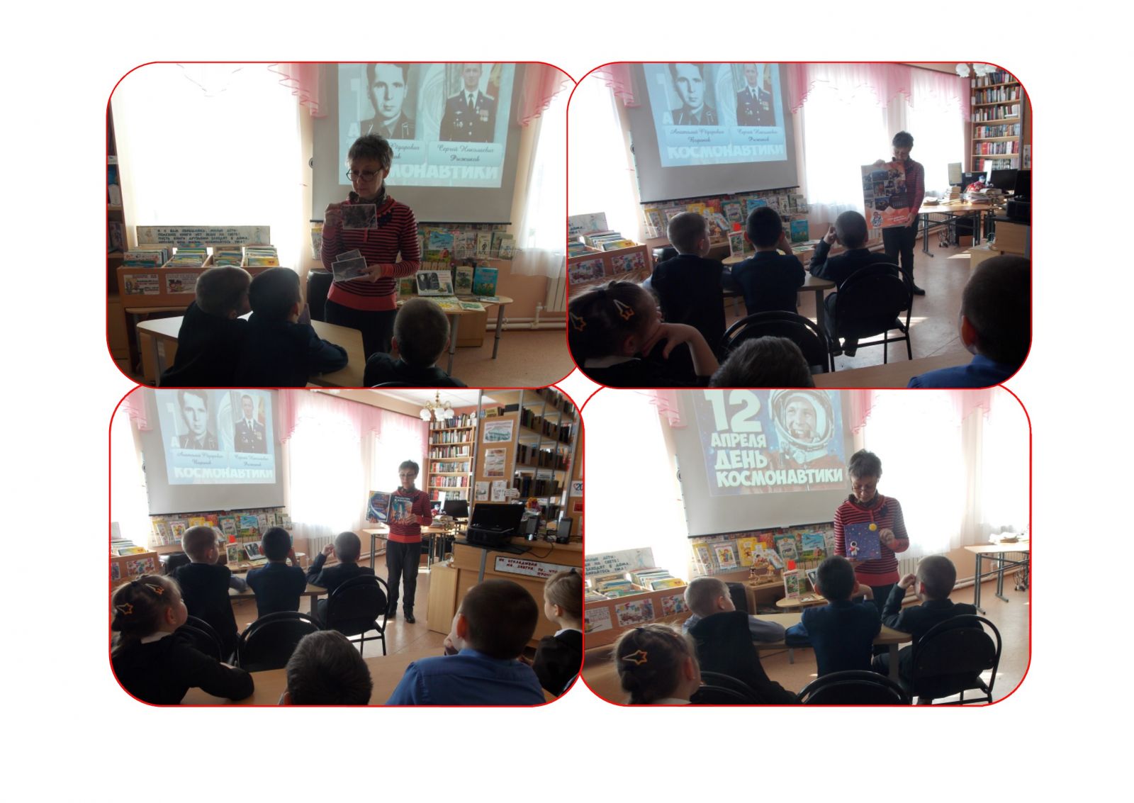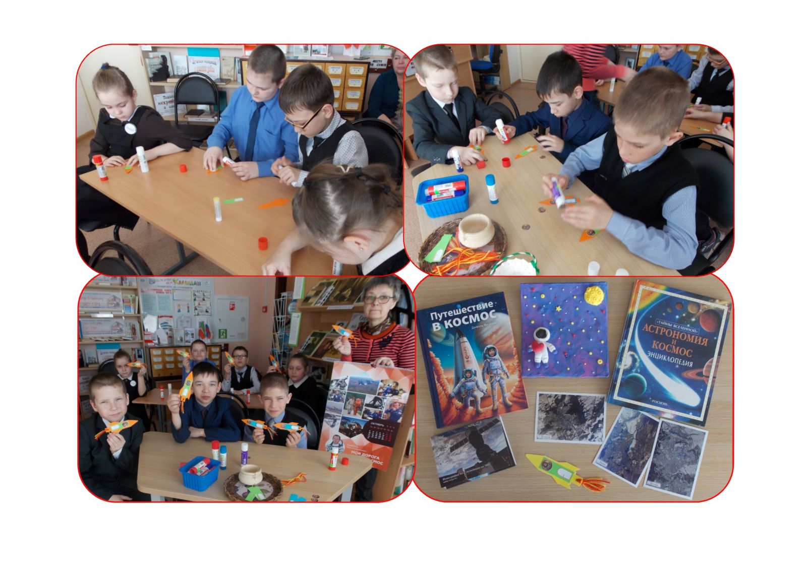Учащиеся 1-4 классов совершили «Космическое путешествие», где узнали о Юрии Алексеевиче Гагарине, первым проложившим дорогу в космос, и о людях, самоотверженный труд которых позволил воплотить идею космических полетов. Сельский библиотекарь отметила: зеленорощинцы горды, что в рядах покорителей космических далей стоят и наши земляки: полковник запаса, заслуженный штурман-испытатель СССР Анатолий Фёдорович Воронов и космонавт-испытатель отряда космонавтов Роскосмоса, Герой Российской Федерации, почётный гражданин г. Бугульмы Сергей Николаевич Рыжиков. Юные читатели ознакомились с книгами на тему освоения космоса, а также внимательно рассмотрели фотографии, сделанные Сергеем Рыжиковым во время экспедиции на Международную космическую станцию. Среди изображений неповторимой красоты нашей планеты ребятам особенно запомнились фотоснимки городов Бугульмы и Казани. На память о «Космическом путешествии» читатели изготовили книжные закладки в виде ракеты, из иллюминатора которой смотрят космонавты – Гагарин и Рыжиков.