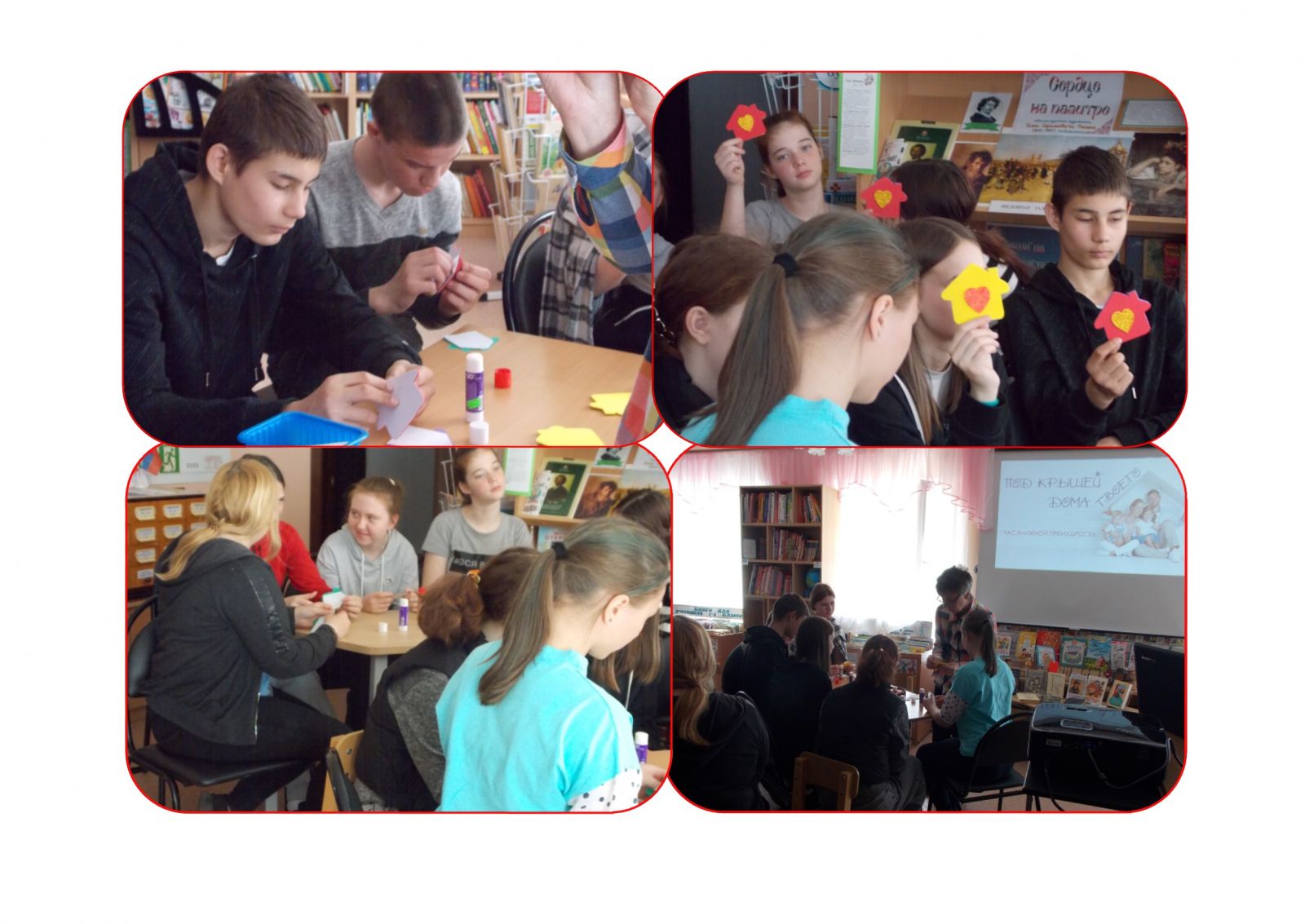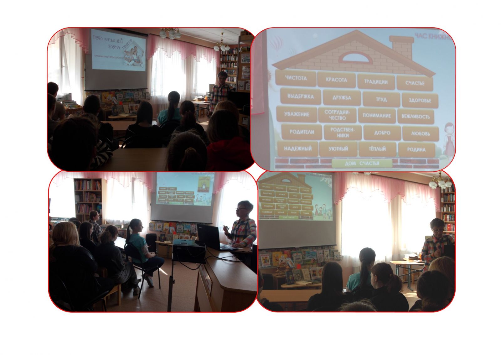 В рамках празднования Года семьи в РФ учащиеся 8-9 классов были приглашены в сельскую библиотеку на час книжной премудрости «Под крышей дома твоего», где библиотекарь предложила построить «Дом счастья» из кирпичиков: традиции, сотрудничество, здоровье, красота, понимание, уважение, любовь, счастье и т.д. Закладывая каждый кирпичик, библиотекарь демонстрировала из фонда библиотеки книгу, соответствующую данному определению. Затем читатели приняли участие в литературной викторине «Счастливый дом» и мастер-классе по изготовлению семейного оберега «Мудрая книга».