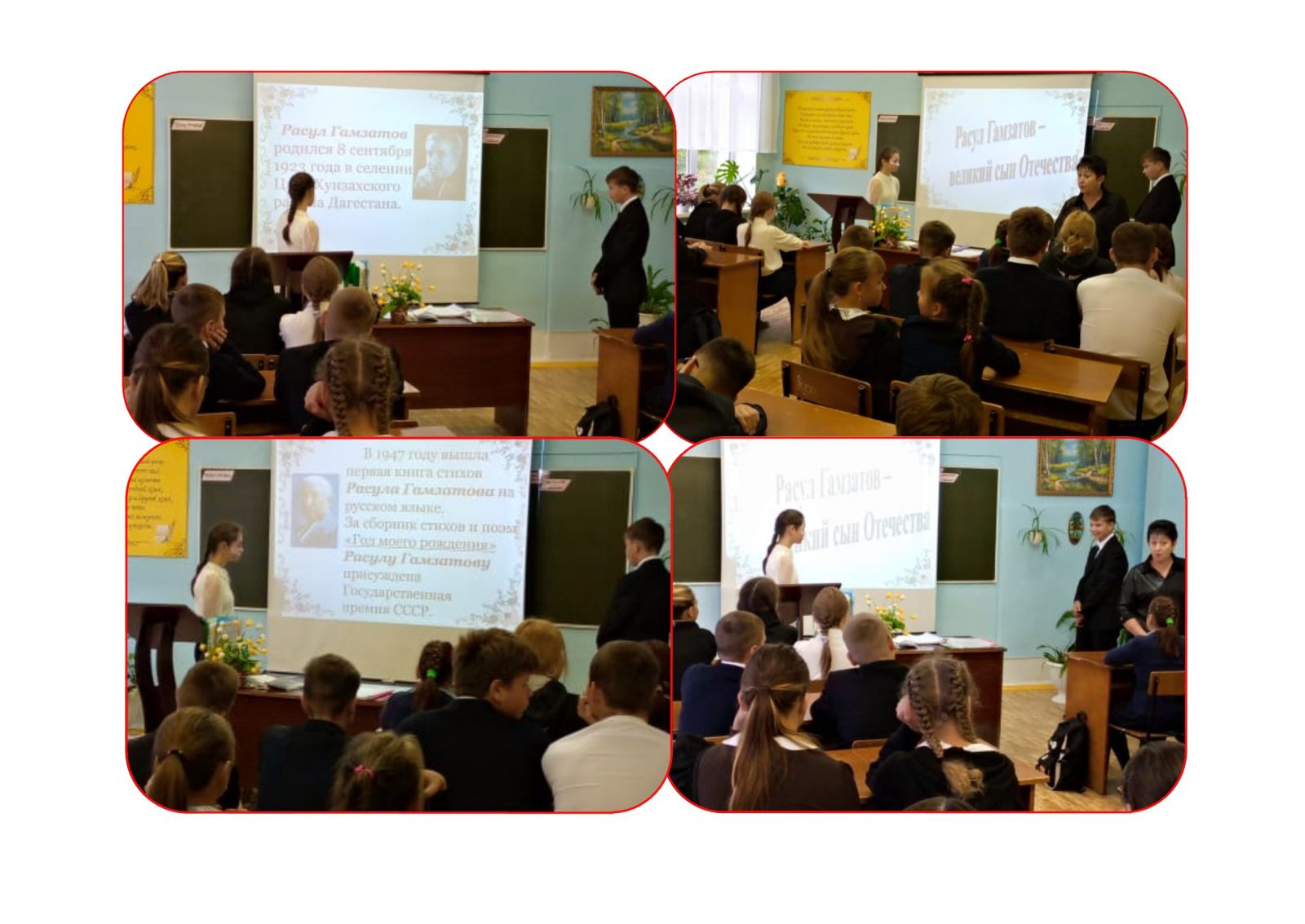 В школе прошел познавательный час «Открыл я книгу вековую», посвященный 100-летию со дня рождения народного поэта Дагестана Расула Гамзатова. Учащиеся узнали интересные факты жизни и творчества поэта, а также его общественной деятельности. Учительница литература отметила, что стихотворения Гамзатова передают воздух гор, неповторимую атмосферу дружбы и за многими его произведениями кроется своя реальная история. Творчество Расула Гамзатова – единая книга, книга мудрости и мужества, книга любви и боли.