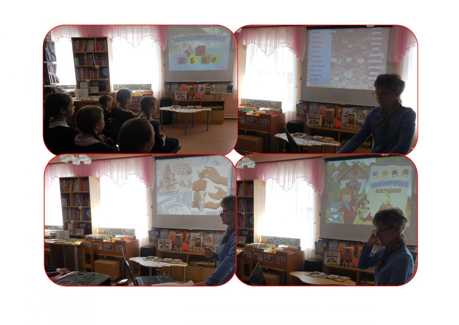 В сельской библиотеке для учащихся школы проведена литературно-интерактивная викторина «Экономическая азбука». Участникам задавались вопросы, ответы на которые – экономические термины, начинающиеся на определённую букву алфавита. Кроме самого вопроса, предлагался также иллюстративный материал. Для нахождения подсказок библиотекарь предложила обратиться к книгам из фонда библиотеки.