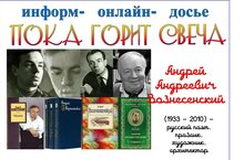 Библиотекарь сельской библиотеки приглашает учащихся и педагогов школы к просмотру информ-досье о поэте, прозаике, художнике А. Вознесенском. Вы узнает не только факты творчества Андрея Андреевича, но и о неприятии его, гонении и обвинении во враждебности со стороны руководства страны. Но это преходящее, а талант вечен. В разные годы было издано более 20 сборников стихов и поэм Вознесенского. В 1978 году он удостоился Государственной премии СССР. В памяти миллионов людей Андрей Вознесенский остается автором легендарной рок-оперы «Юнона и Авось» и пронзительных строк: «Я тебя никогда не забуду…»