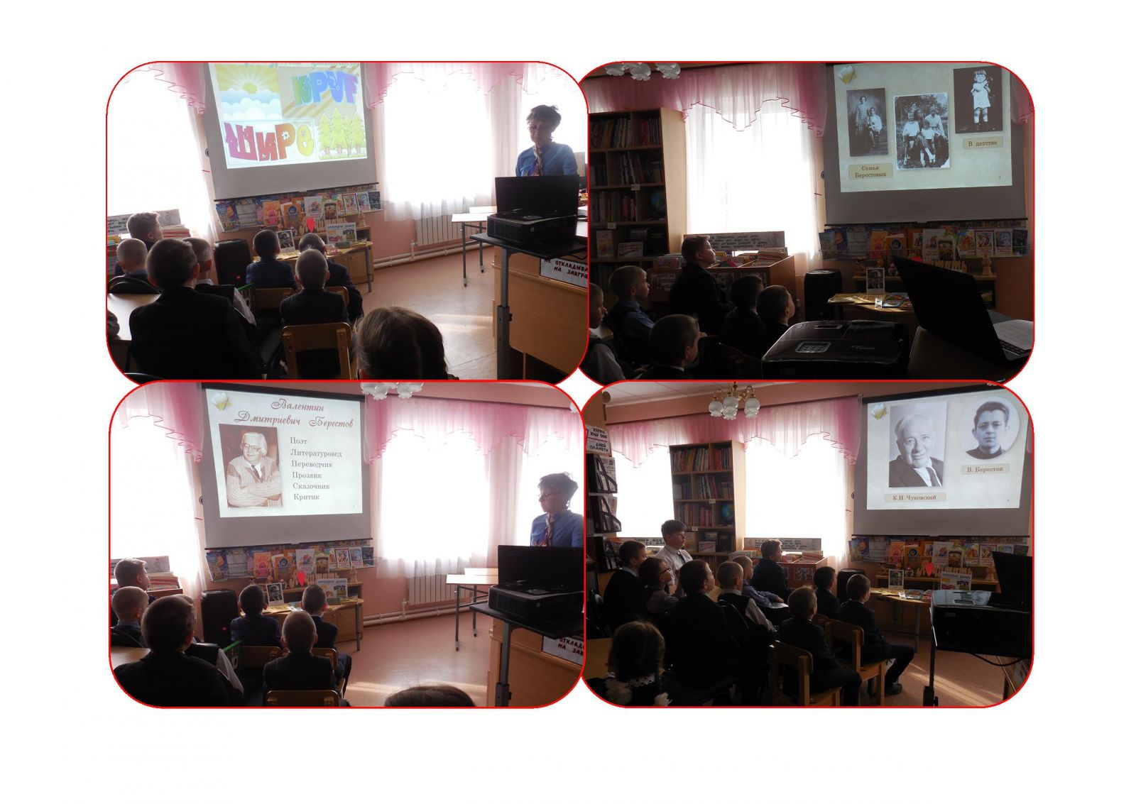 Ученики 1-4 классов были приглашены в сельскую библиотеку совершить путешествие на литературном дилижансе «Шире круг» по стихам поэта, переводчика и литератора Валентина Дмитриевича Берестова. Ребята ознакомились с основными этапами жизненного пути поэта, с событиями, оказавшими влияние на его литературную деятельность, прослушали его стихи, отгадали написанные им загадки, просмотрели книги с произведениями автора из фонда библиотеки.