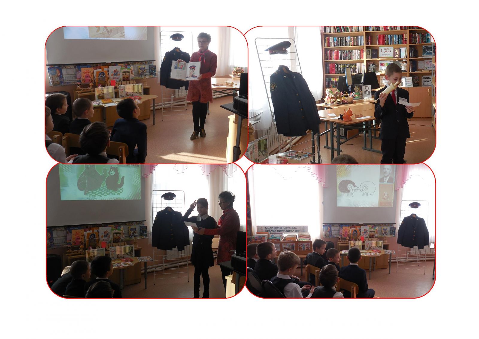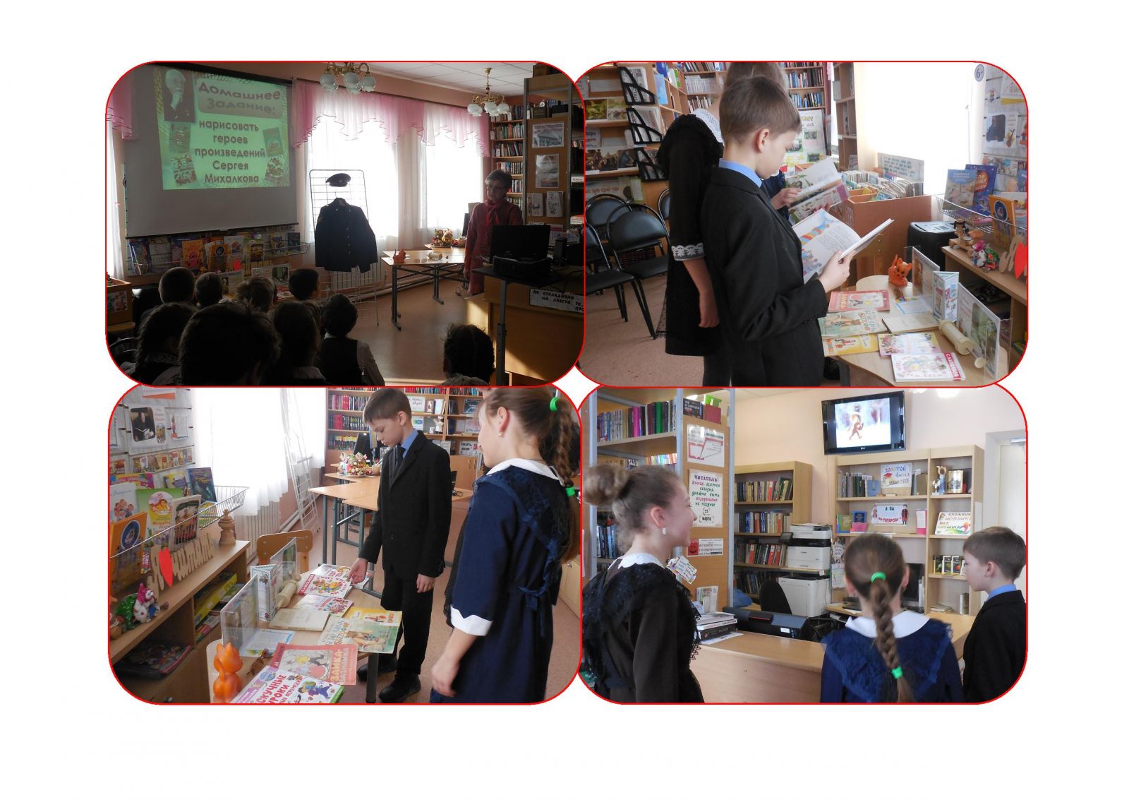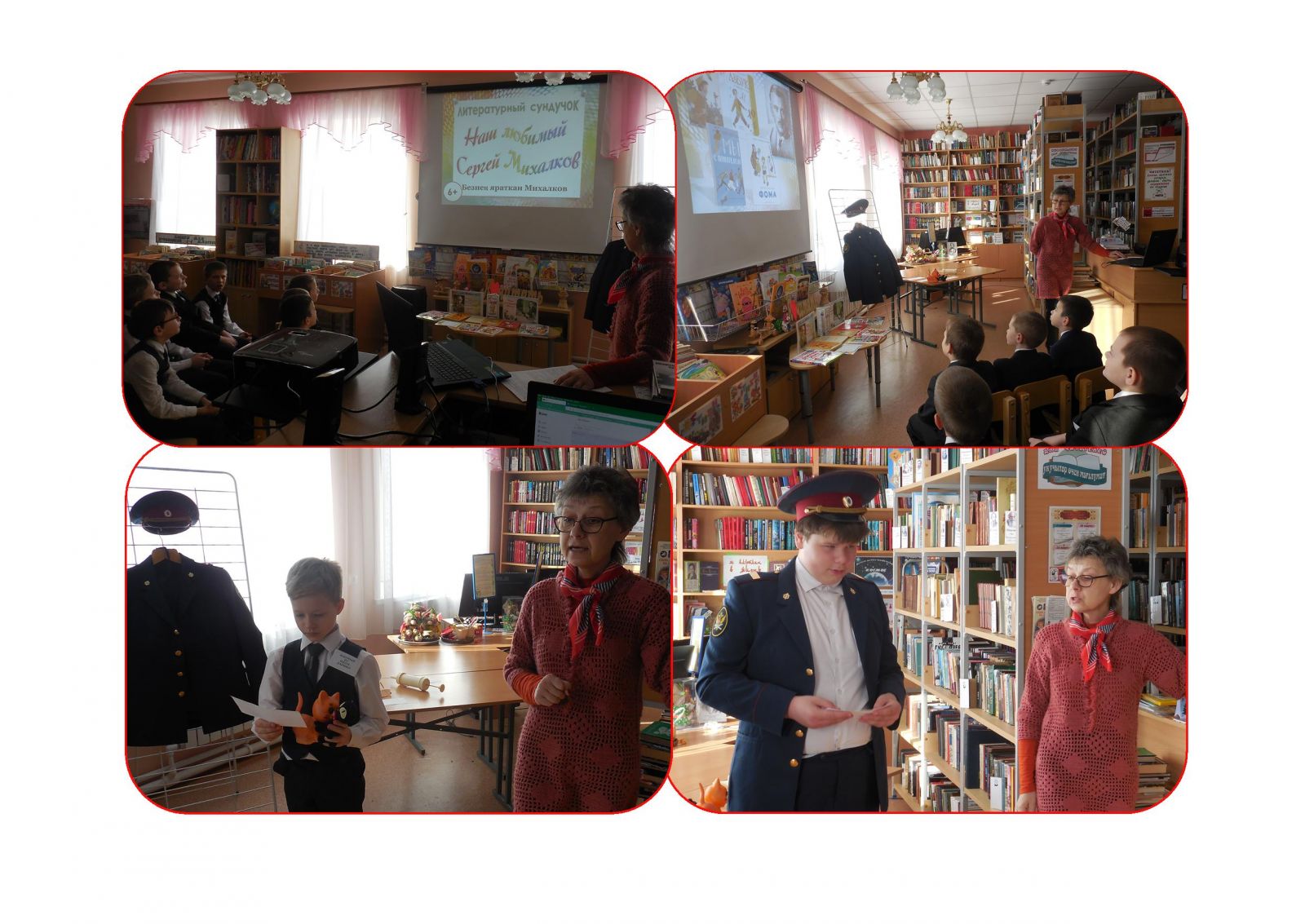 Сельский библиотекарь пригласила учеников 1-4 классов раскрыть литературный сундучок «Наш любимый Сергей Михалков», где были собраны факты из жизни и творчества поэта, а также рекомендательный обзор его произведений. Кроме этого звучали песни на стихи Михалкова, ребята читали отрывки из произведений «Дядя Степа», «Про очки», «Котята», «Прививка», разгадывали кроссворд и отвечали на вопросы викторины, смотрели фрагмент мультфильма «Петух в гостях» и получили домашнее задание: нарисовать героев литературных произведений С. Михалкова.