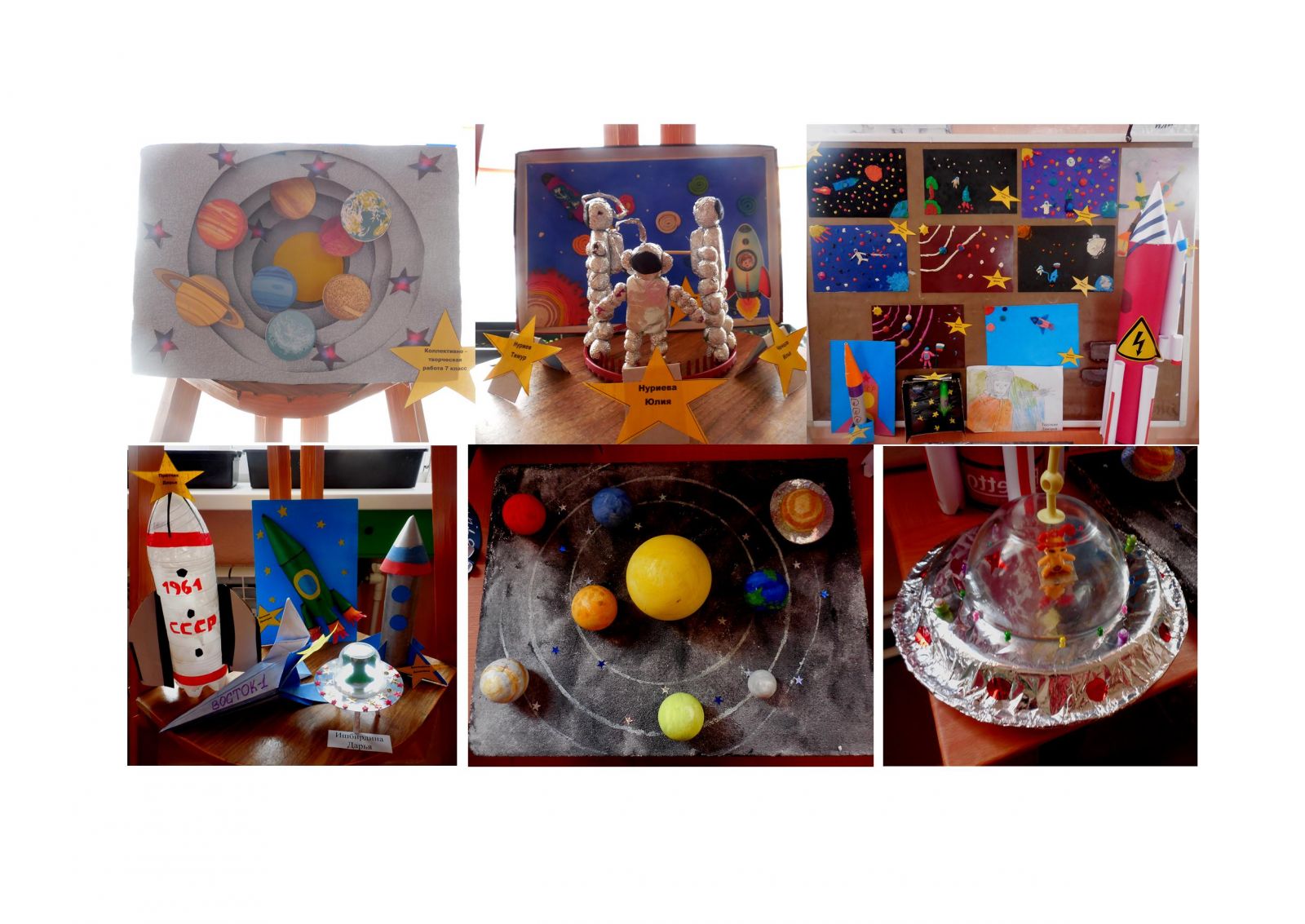 В канун дня космонавтики ученики школы приняли участие в оформлении выставки «Космос далёкий и близкий», проявив свою фантазию и умение превращать бросовый материал в прекрасные поделки.