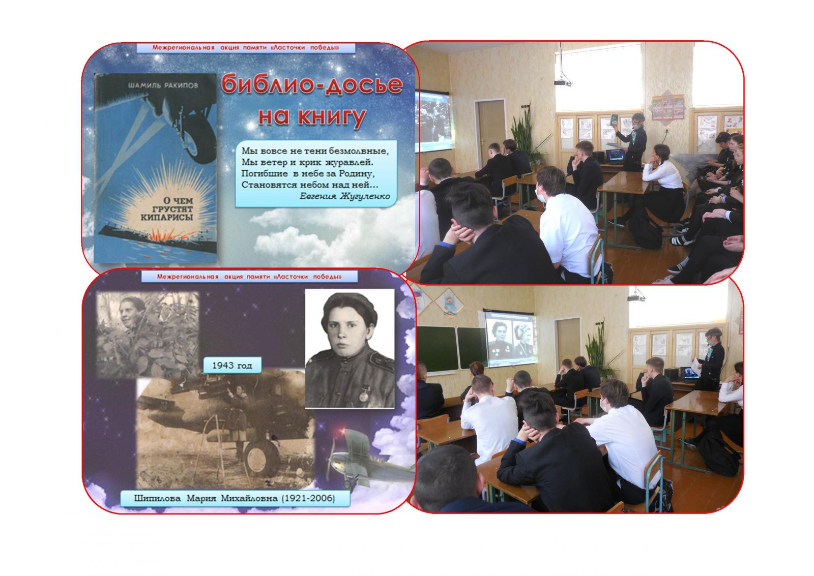 В рамках Межрегиональной акции памяти «Ласточки победы» сельский библиотекарь представила ученикам 5-9 классов библио-досье на книгу татарского писателя Ш. Ракипова «О чём грустят кипарисы» – документально-художественного романа о лётчицах Героях Советского Союза, которые, не щадя своей жизни, воевали с фашистскими захватчиками в Великую Отечественную войну. Наряду с героями книги вспомнили и односельчанку – Шипилову Марию Михайловну, оружейницу 57-го бомбардировочного авиаполка им. Б.Хмельницкого ЮЗФ, кавалера ордена Отечественной войны II степени. В заключение присутствующие посмотрели музыкальный видеоклип на стихи Героя Советского Союза Евгении Жугуленко «Когда вы песни на земле поёте»