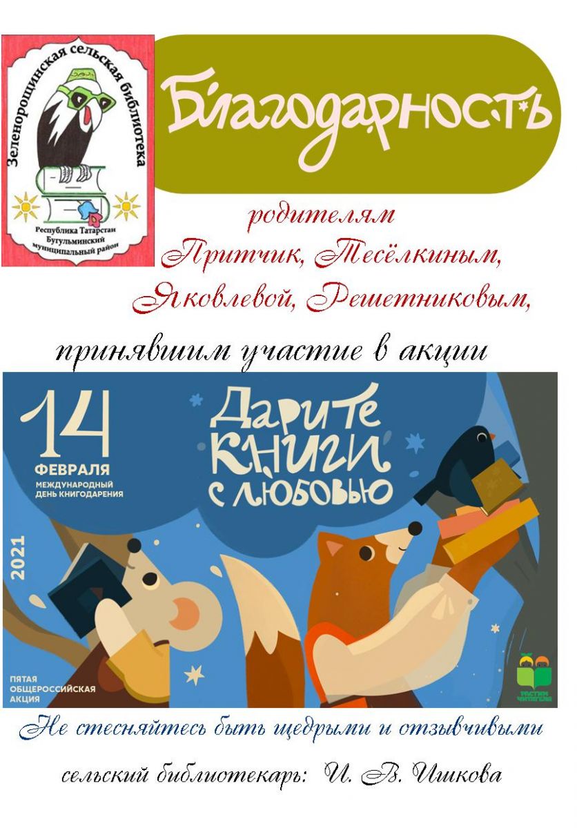Педагогический коллектив, ученики 1-9 классов приняли активное участие в общероссийской акции «Дарите книги с любовью» в Международный день книгодарения, в праздник, призванный прививать любовь к чтению.Своим участием в акции зеленорощинцы показали, что бумажная книга остаётся актуальна и не теряет своей ценности. Благодаря такому мероприятию фонд сельской библиотеки пополнился множеством книг: научно-познавательными, произведениями классиков и детских писателей. К примеру, семья Притчик предложила из домашней библиотеки14 книг, семья Фаритовых – 28 экземпляров, от воспитанников детского сада, от каждого школьного класса поступило по 3-4фолианта. Всем дарителям библиотекарь,вручила стикеры и книжные закладки с официальным логотипом акции, говорила слова признательности и благодарности.