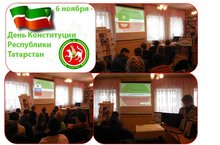 В канун 25-летия со дня принятия Конституции Республики Татарстан был проведен познавательный час «Основной закон республики», где читателей 6-9 классов библиотекарь кратко познакомила с разделами и статьями документа, а так же правами и обязанностями граждан РТ. В завершении по затронутым вопросам была проведена викторина «Знатоки Конституции». Здесь читатели показали себя знающими и уважающими основной закон Татарстана.
