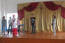 "День добрых начинаний". На общешкольной линейке дан старт. Учащиеся 6 класса инсценировали сказку " Про Красную шапочку и всех, всех..." (на новый лад)