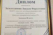 Поздравляем коллегу Залялетдинову Ландыш Фярьгатовну , занявшую II место в муниципальном этапе республиканского смотра-конкурса "Зеленый огонек- 2024" в номинации "Лучший воспитатель ДОУ по обучению детей правилам безопасного поведения на дорогах и пропаганде БДД среди родителей" и желаем дальнейших ей побед!