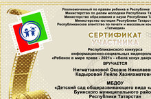 МБДОУ "Аленушка" приняла участие в VII Республиканском конкурсе информационно-социальных видеороликов «Ребенок в мире прав» – «Бала хокук даирәсендә» и удостоились награды.