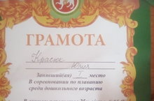20 мая 2017 г. воспитанница подготовительной группы МБДОУ "Ромашка" Красюк Ю. заняла 1 место в соревнованиях по плаванию среди дошкольников Буинского муниципального района.