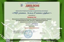 Поздравляем воспитанницу 1 младшей группы Захарову Еву, занявшую 1 место во всероссийском творческом конкурсе по экологическому воспитанию "Эко- знания. Земля в наших руках!" (руководитель Тазиева)