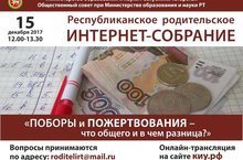 15 декабря 2017 года в 12.00- 13.30 часов состоится Республиканское родительское «Интернет – собрание» по теме: «Поборы и пожертвования – что общего и чем разница?»