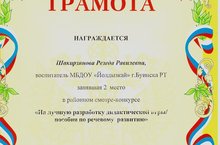 Воспитатель МБДОУ «Йолдызкай» Шакирзянова Резеда Равилевна, заняла 2 место в районном смотре конкурсе «На лучшую разработку дидактической игры пособия по речевому развитию». Поздравляем победителя! Желаем педагогу дальнейших творческих успехов.