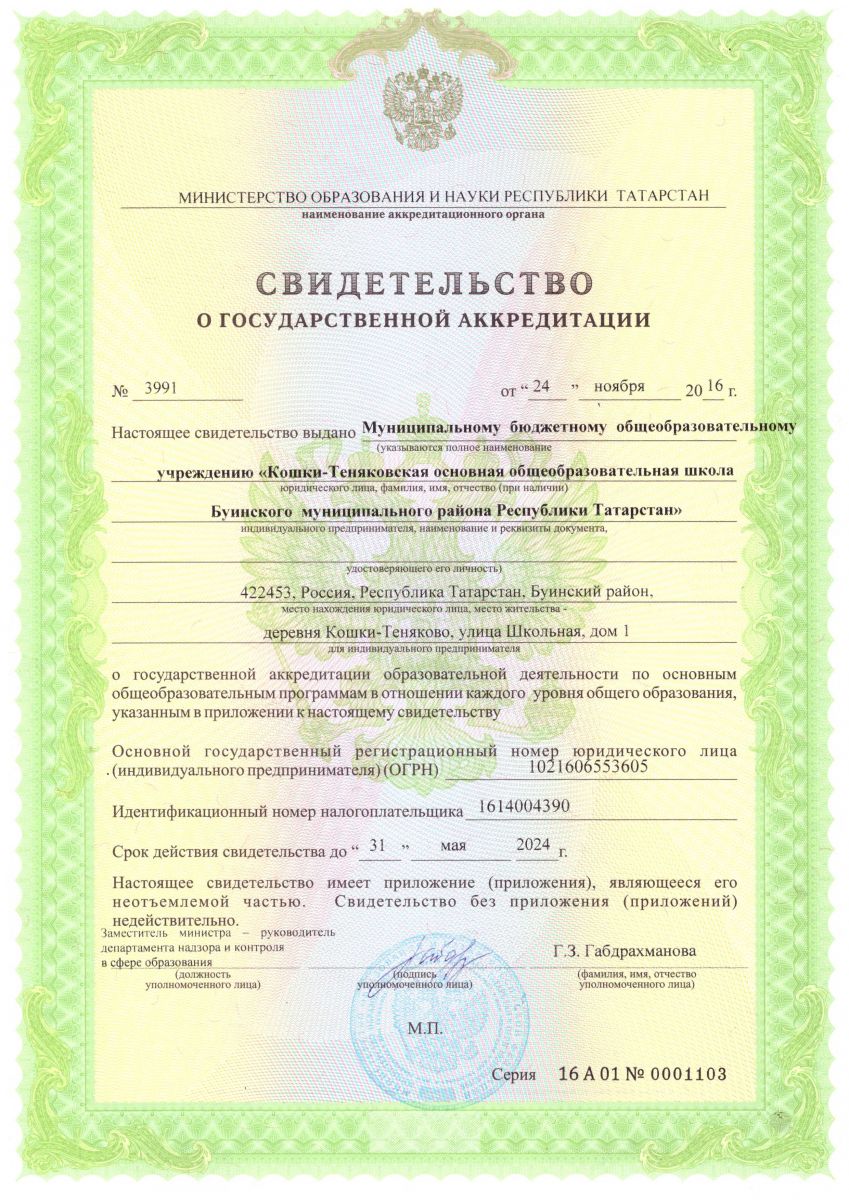 | Адрес: | 422453, Республика Татарстан, Буинский район, д. Кошки-Теняково, ул. Школьная, дом 1 |