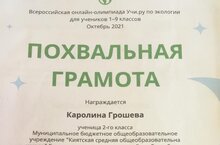 Учащиеся 2 класса приняли активное участие во Всероссийской олимпиаде по экологии на образовательной платформе учи ру. Грошева Каролина награждена похвальной грамотой.