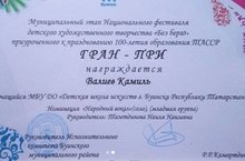 Поздравляем Камиля В., ученика 5 класса нашего лицея , удостоившегося титула Гран-При в муниципальном этапе Национального фестиваля детского художественного творчества «Без бергэ»(номинация «Народный вокал»(соло) Молодец!!!(рук. Тазетдинова).