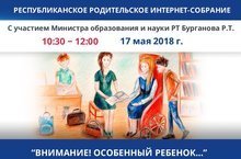 Уважаемые родители! 17 мая с 10.30 по 12.00 на сайте киу.рф состоится онлайн-трансляция Республиканского родительского интернет-собрания «Внимание! Особенный ребенок…» (Об особенностях воспитания и обучения детей с ограниченными возможностями здоровья) Свои вопросы можно задать по адресу: roditelirt@mail.ru
