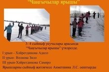 Мәктәптә хәрби-патриотик тәрбия айлыгы дәвам итә.Айлык кысасында 3- 4 сыйныф укучылары арасында “Чаңгычылар ярышы” үткәрелде. Нәтиҗәдә : I урында - Хәйретдинова Адилә, II урында- Вәлиева Зилә, III урында -Хәйретдинова Самирә булды. Ярышларны сыйныф җитәкчесе Ахметшина Л.С. оештырды. 11.02.2016