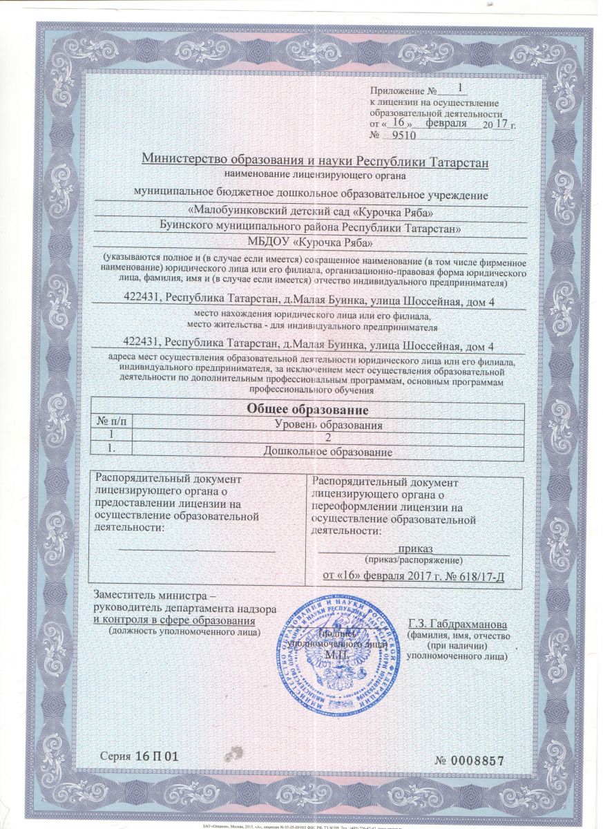| Адрес: | 422431, Республика Татарстан, Буинский район, д.Малая Буинка, ул.Шоссейная, д.4 |