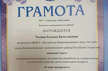 Поздравляем Тютину Евгению Вячеславовну с победой в муниципальном конкурсе методических разработок по художественно - эстетическому развитию детей дошкольного возраста « В мире прекрасного» среди ДОУ города Буинска и Буинского муниципального района в номинации «Педагогические технологии»