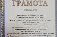 Поздравляем Гиматдинову Лилию Мазитовну и Гиматдинову Альфию, занявших 2 место в муниципальном конкурсе конспектов занятий, посвященных году педагога и наставника «Лучший конспект в ДОУ» среди ДОУ города Буинска и Буинского муниципального района РТ