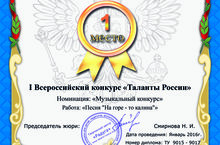 Ансамбль "Улыбка" (5-6 лет) занял 1 место во Всероссийском конкурсе "Таланты России" в номинации "Музыкальный конкурс" (работа: песня "На горе-то, калина"). Руководители: Тазетдинова Н.Н., Рахматуллина Г.И., Шамсутдинова Г.З., Исрафилова Г.Р.