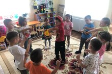 Сегодня воспитанники старшей и подготовительной к школе группы разучивали танец- игру "Пожарная машина". Они ритмично повторяли все движения и проговаривали текст игры.
