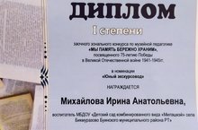 Гулиев Аслан,воспитанник старшей разновозрастной группы, совместно с воспитателем Михайловой И.А. принял участие и получил диплом I степени в заочном зональном конкурсе по музейной педагогике "Мы память бережно храним", посвященного 75- летию Победы в номинации "Юный экскурсовод".